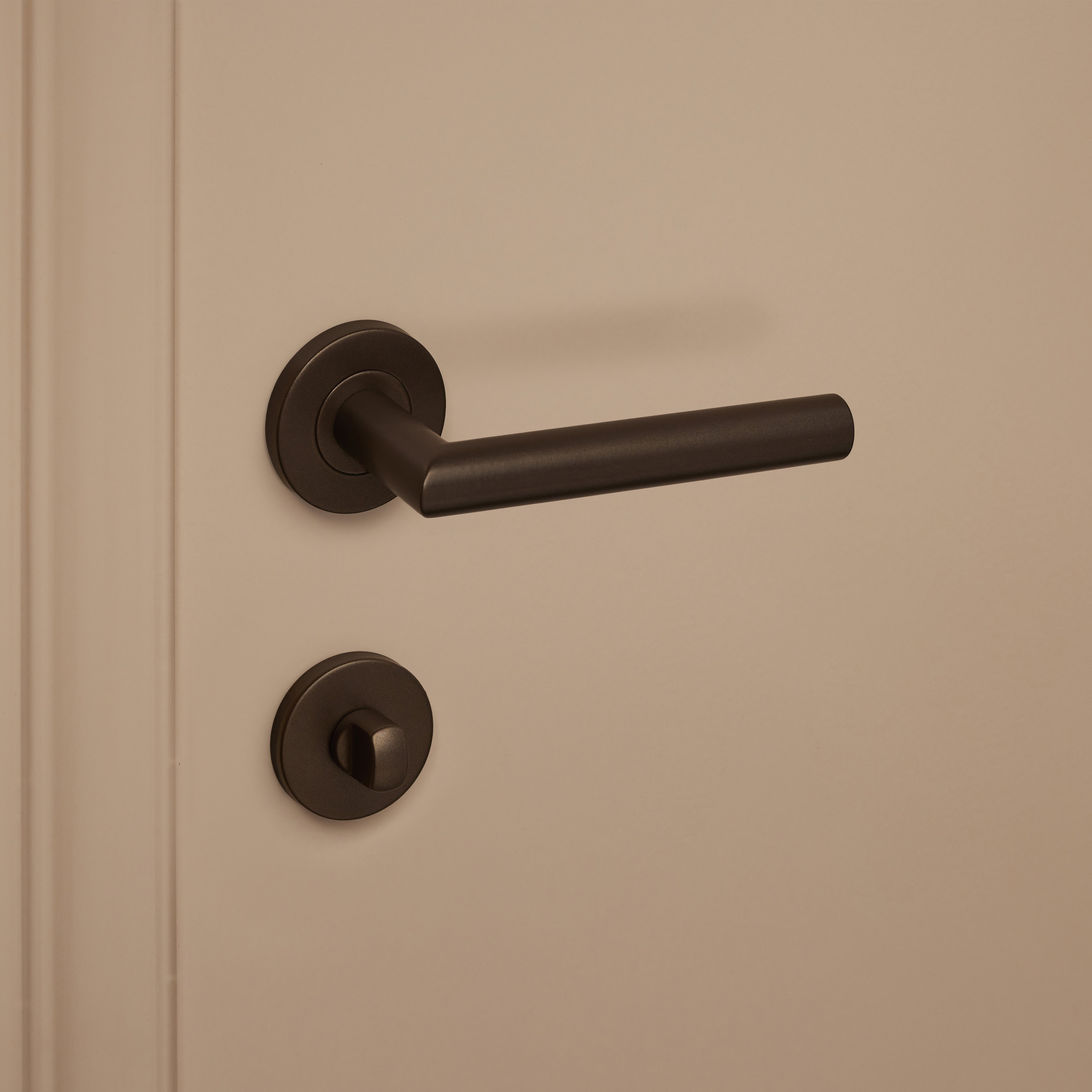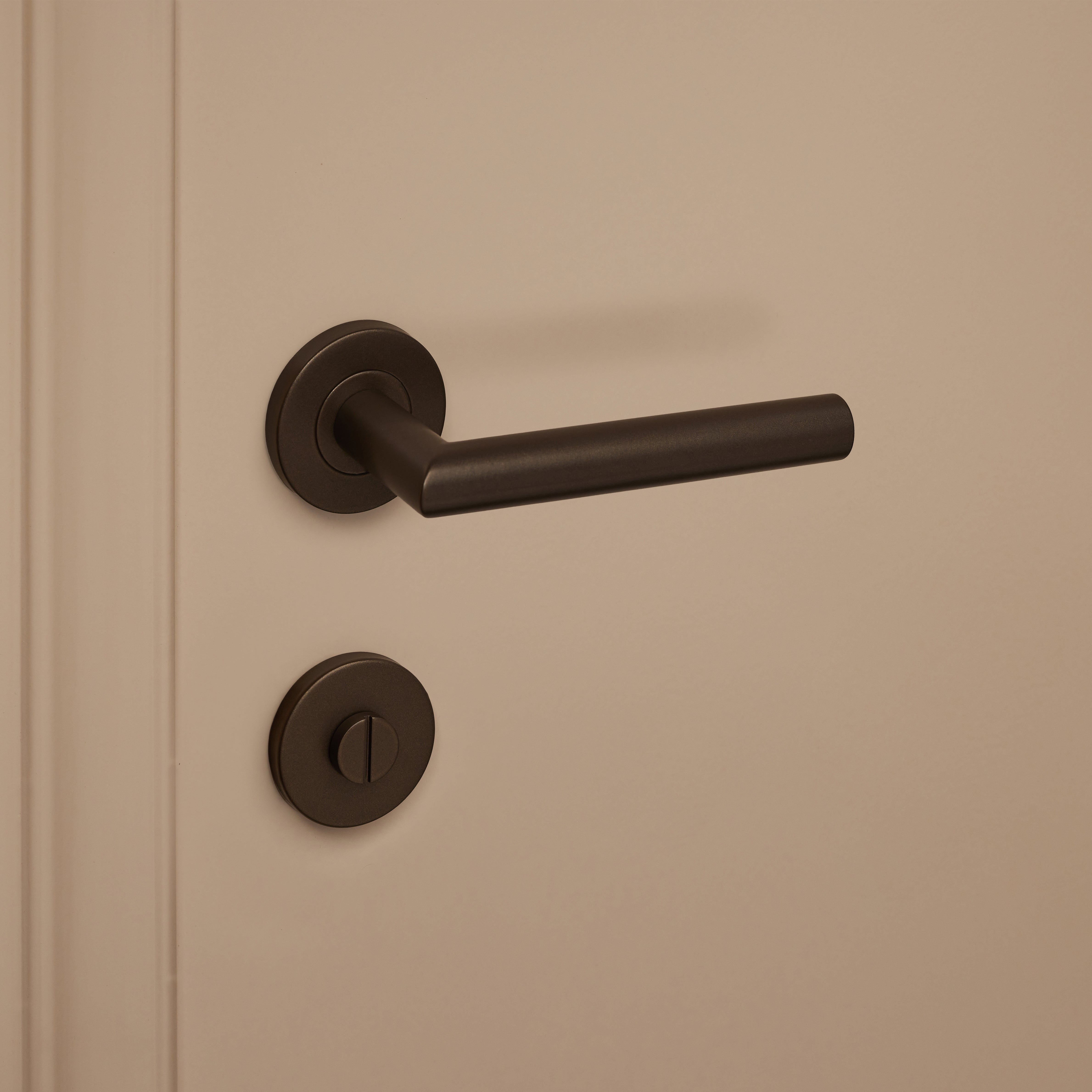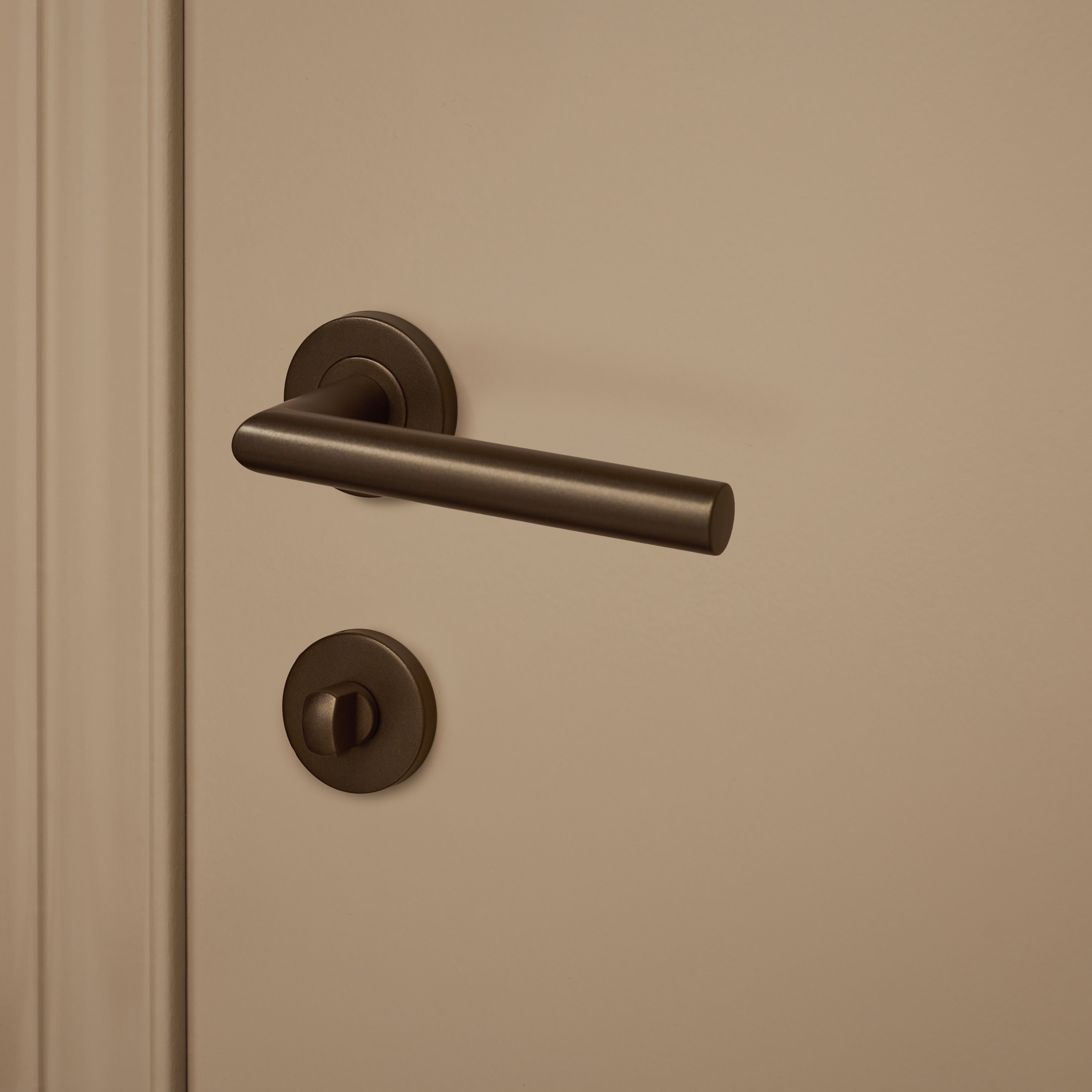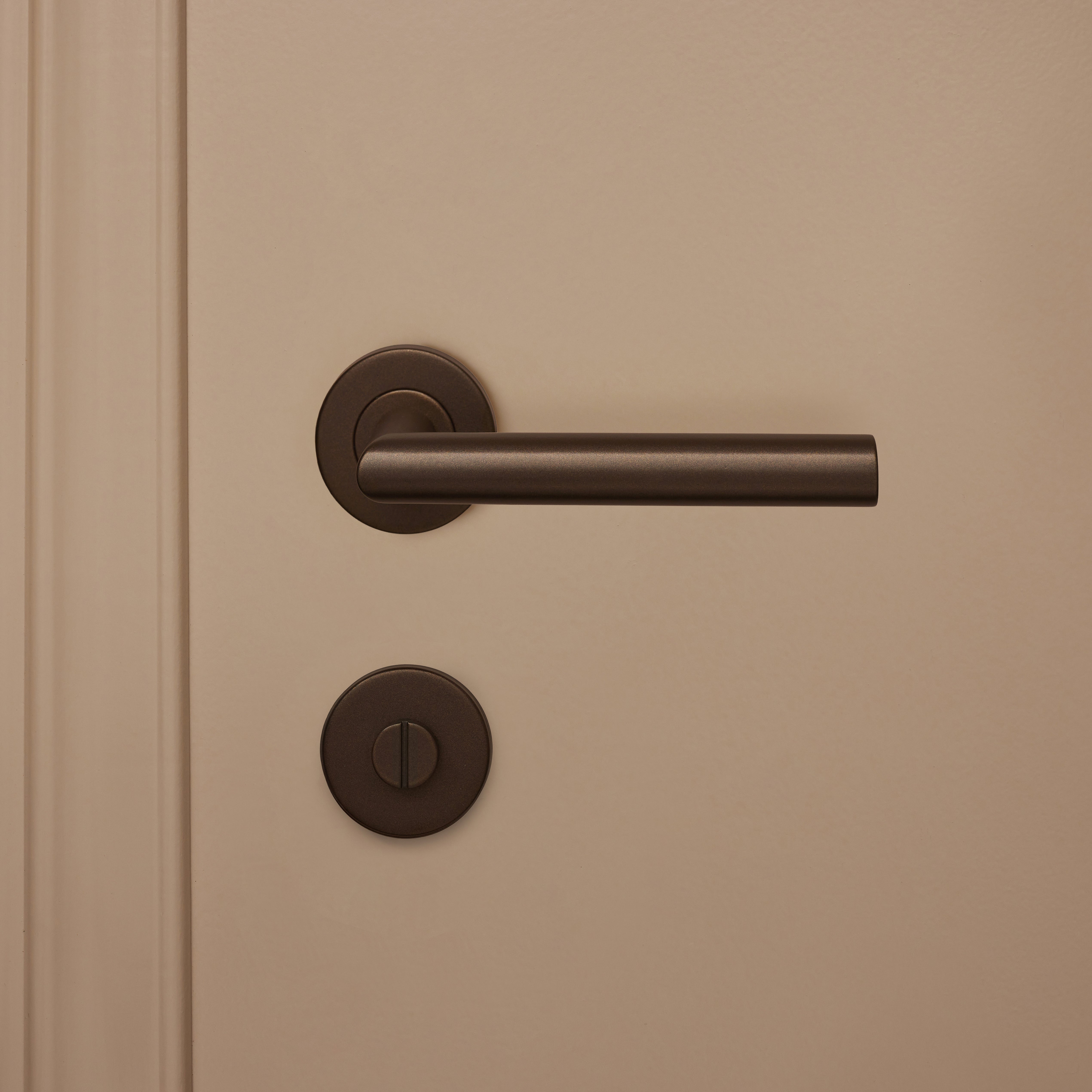 This bronze toilet lock on a round rosette is the perfect complement to your bronze door handle with a round rosette. Its round shape creates a timeless, soft look and feel. The beautiful bronze finish combines a luxurious appearance with the durability needed for daily use. The durability of this bathroom lock is enhanced by its production from high-quality stainless steel materials.