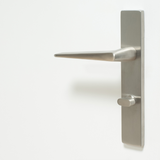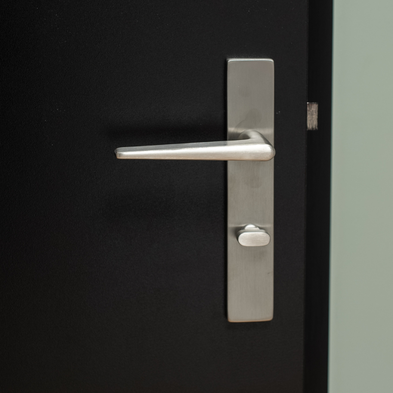 This set is suitable for interior doors with a standard bathroom latch at 63 mm center-to-center. The backplate neatly covers old drill holes and creates a neat appearance. The brushed stainless steel finish is durable, stain-resistant, and easy to clean.