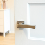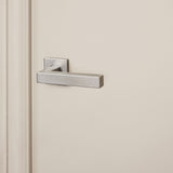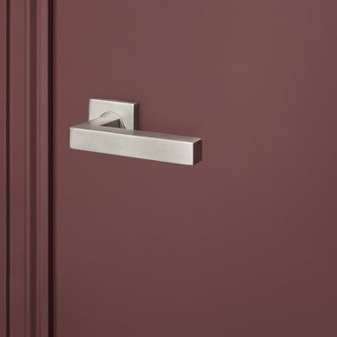 This door handle is made of high-quality stainless steel, ensuring durability and long life. The square rosette adds a modern touch and subtly conceals old drill holes.